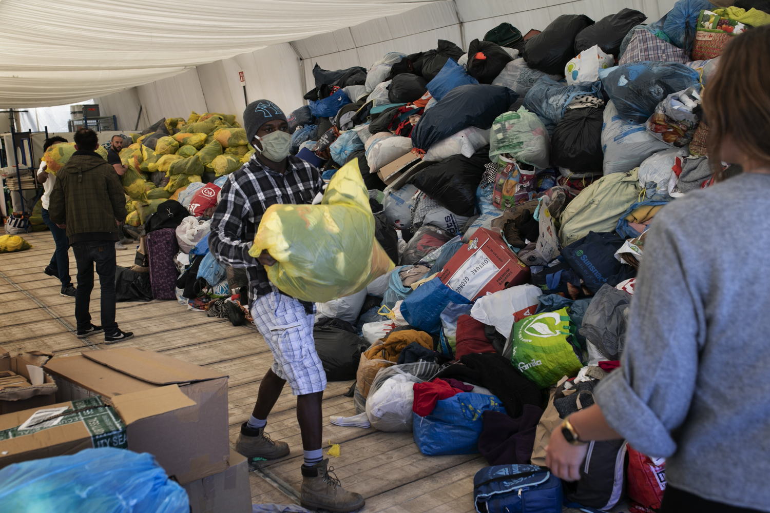 Environ 300 personnes en situation d'exclusion sociale (y compris les sans-abri, les migrants et les demandeurs d'asile) assistent à la distribution de kits alimentaires et d'hygiène soutenue par MSF, la Croix-Rouge et Platerforme Citoyenne © Albert Masias