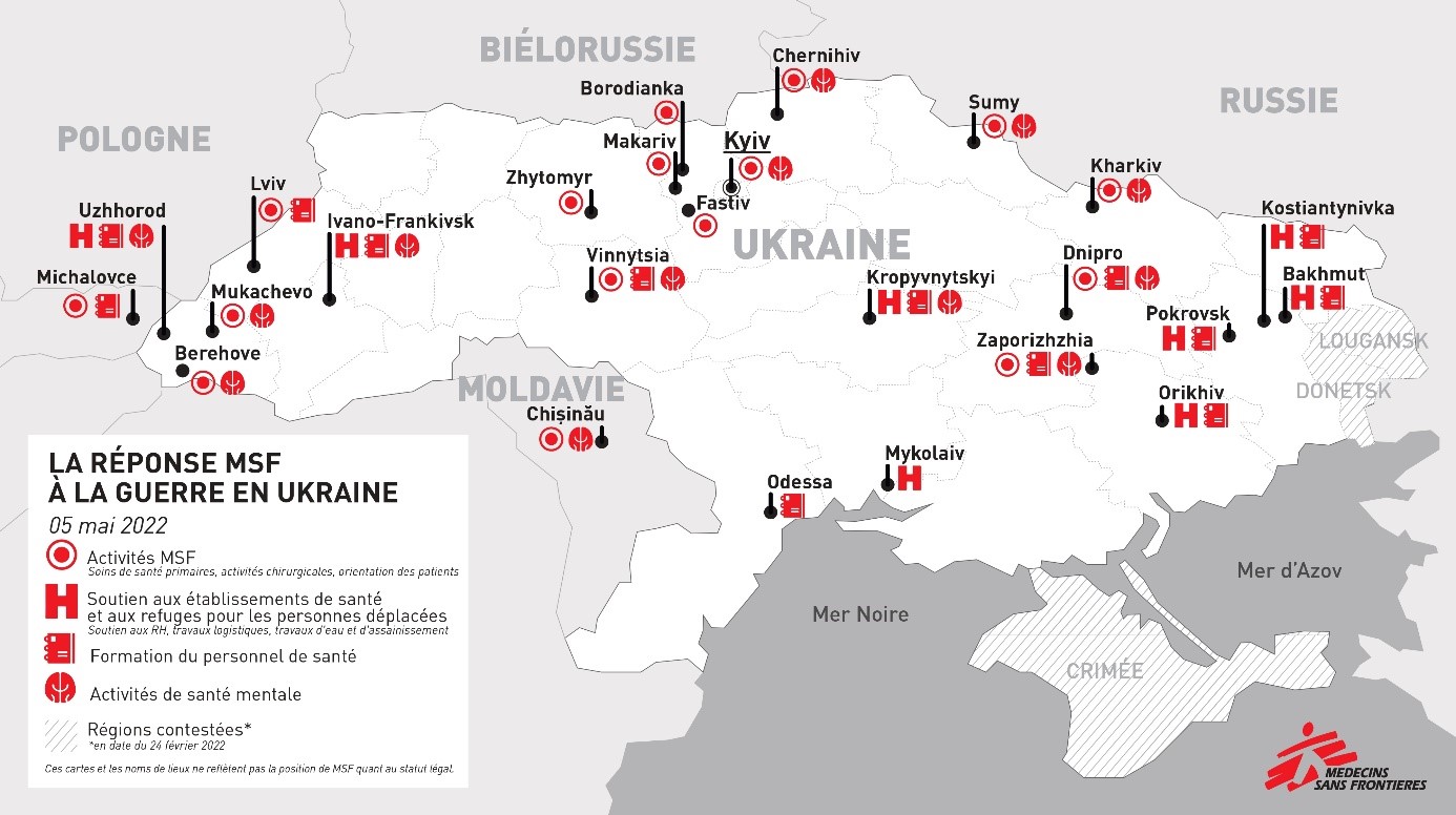 MSF emploie actuellement environ 160 employés internationaux en Ukraine et compte plus de 490 employés ukrainiens. Nos collègues travaillent en tant que personnel médical, notamment des médecins, des infirmiers et des psychologues, mais aussi dans la logistique, l'administration et la gestion. Depuis le 24 février, MSF a apporté plus de 485 tonnes de matériel médical et de secours en Ukraine.