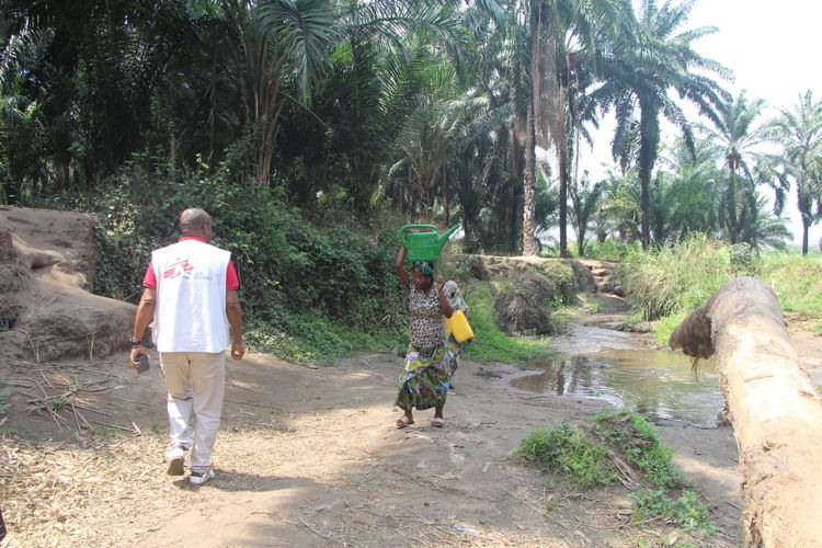 : An MSF Water, Sanitation and Hygiene technician on a supervisory visit to water chlorination sites encounters a woman who has just drawn water from the Luke River in the village of Katanga, Fizi territory, South Kivu, Democratic Republic of Congo. Copyright: Abdon MANENGU Mbangala/MSFQuentin Barrea