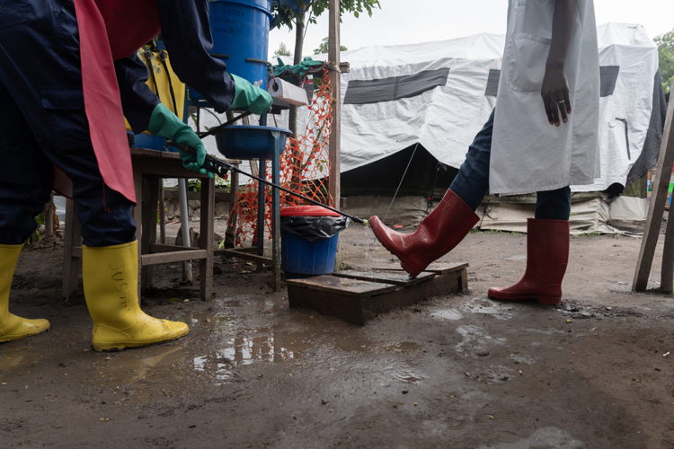 Medical staff and patients entering the cholera treatment centre in Kiseguru must first disinfect their shoes to prevent contamination. Copyright: Sam Bradpiece/MSF