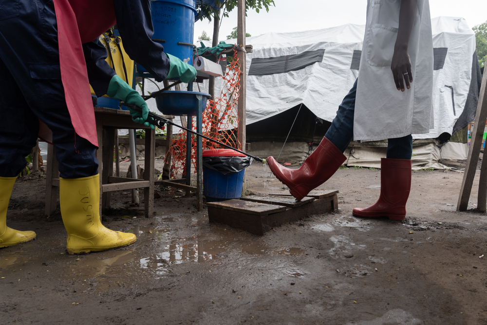 An MSF team member disinfects the room where patients are treated for cholera at the Sake referral health center supported by MSF as part of its emergency response. Copyright: Jospin Mwisha