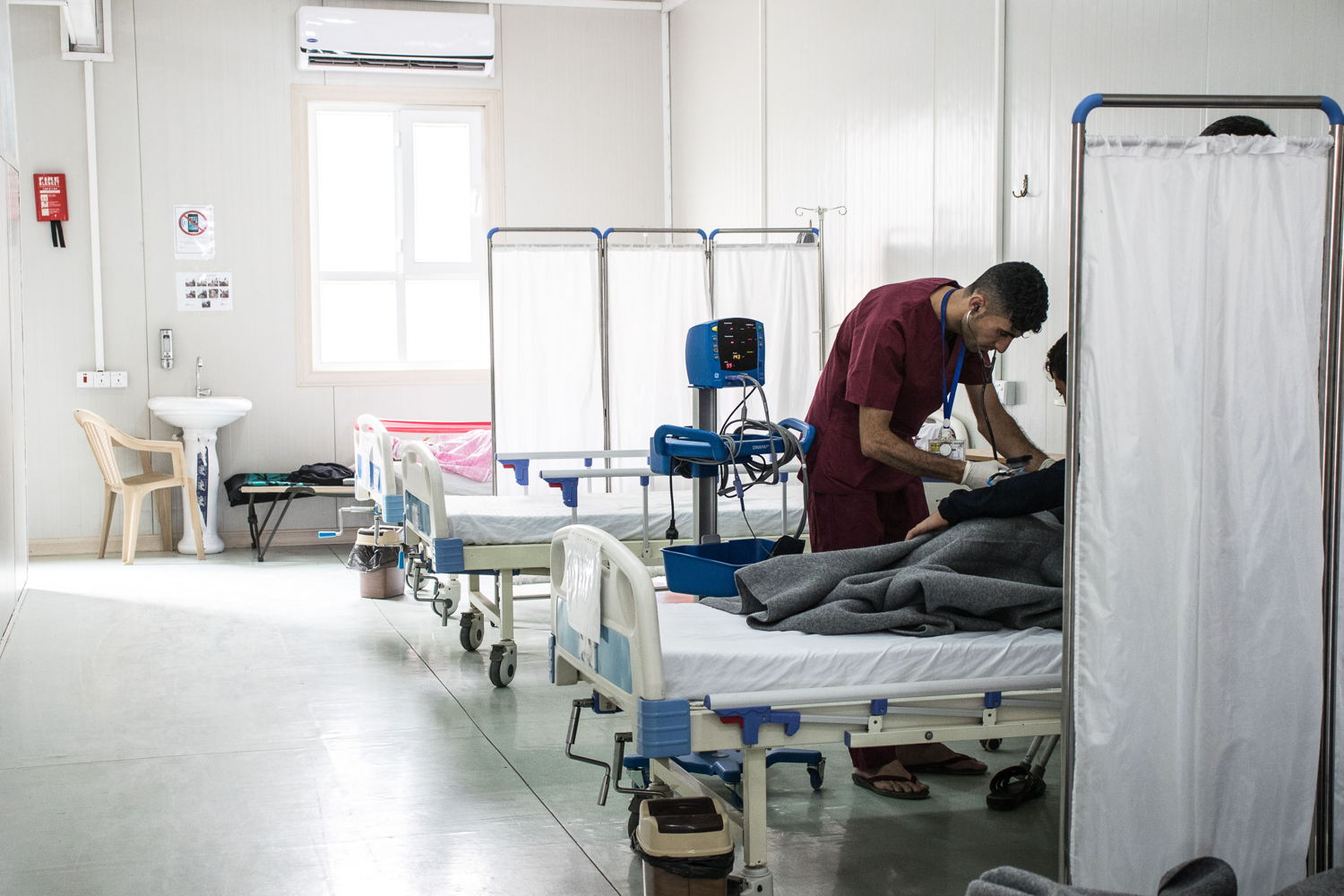 Durant le conflit, neuf hôpitaux publics sur treize ont été endommagés à Mossoul, réduisant la capacité de prise en charge et le nombre de lits d’hôpitaux de 70%. La reconstruction des structures de santé est particulièrement lente, et la ville dispose de moins de mille lits d’hôpitaux pour une population totale de 1,8 million de personnes, soit la moitié des normes minimales internationales régissant les soins de santé dans un contexte humanitaire.